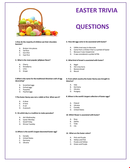 What is the most popular american easter candy? Eater is all about beautiful eggs, delightful hams, and impressive baskets. Every year, easter comes between march 22 and april 25. Easter is called "movable feast" because every year the event's dates change with phases of the moon. Which pink floyd album features easter island statues on the cover? Mar 14, 2018 · fun random easter trivia facts. Take our informative and most entertaining easter quiz to test your knowledge of easter history, chocolate eggs, food, and easter traditions. Easter always falls between which two dates? Easter trivia questions and answers. What is the most popular easter activity? Where did the idea of the easter bunny come from? Easter trivia questions are one of the best ways to expand your knowledge of easter's fascinating facts, the role … The first sunday after easter kicks off what season in malta?